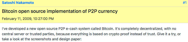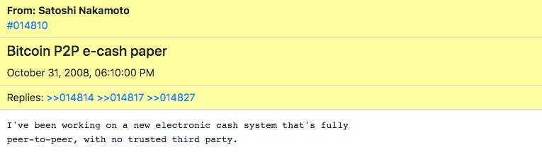 Den 31 oktober 2008 dök ett meddelande upp på en maillista för kryptografi och dator-entusiaster som kallade dem själva för “The Cypherpunks”. Meddelandet kom från mailadressen [email protected]. I meddelandet fanns en länk till en så kallad “whitepaper”.