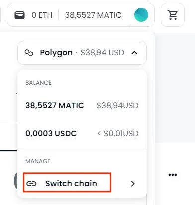 Klicka på din plånbok uppe i höger hörn (Vänster om ”Connect Wallet”). Klicka därefter på rullistan där blockkedjorna nämns. På bilden nedan står det Polygon men det kan även stå namnet på andra kedjor. Sista steget är att klicka på ”Switch again” och välja vilken blockkedja du vill interagera med.