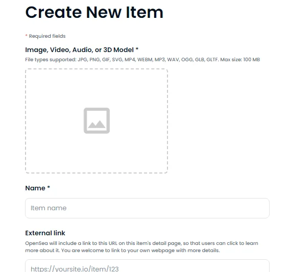 Börja med att ladda upp den fil som ska bli en NFT. Det kan exempelvis vara bild, video, ljud eller en GIF-bild. De filformat som stöds är JPG, PNG, GIF, SVG, MP4, WEBM, MP3, WAV, OGG, GLB, GLTF. Som mest får den vara 100 MB stor.