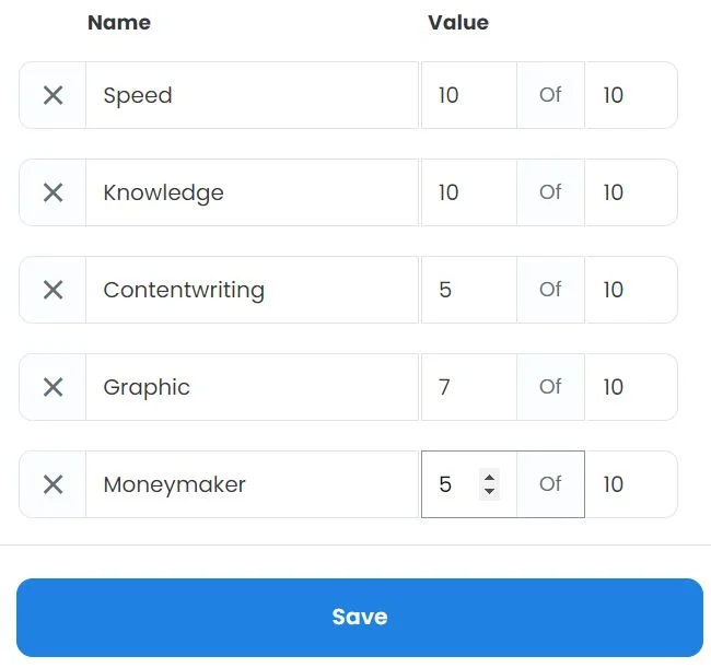 I detta exempel: Som visas på bilden nedan ger vi vår NFT egenskaper som speed, knowledge, contentwriting, graphic och moneymaker.