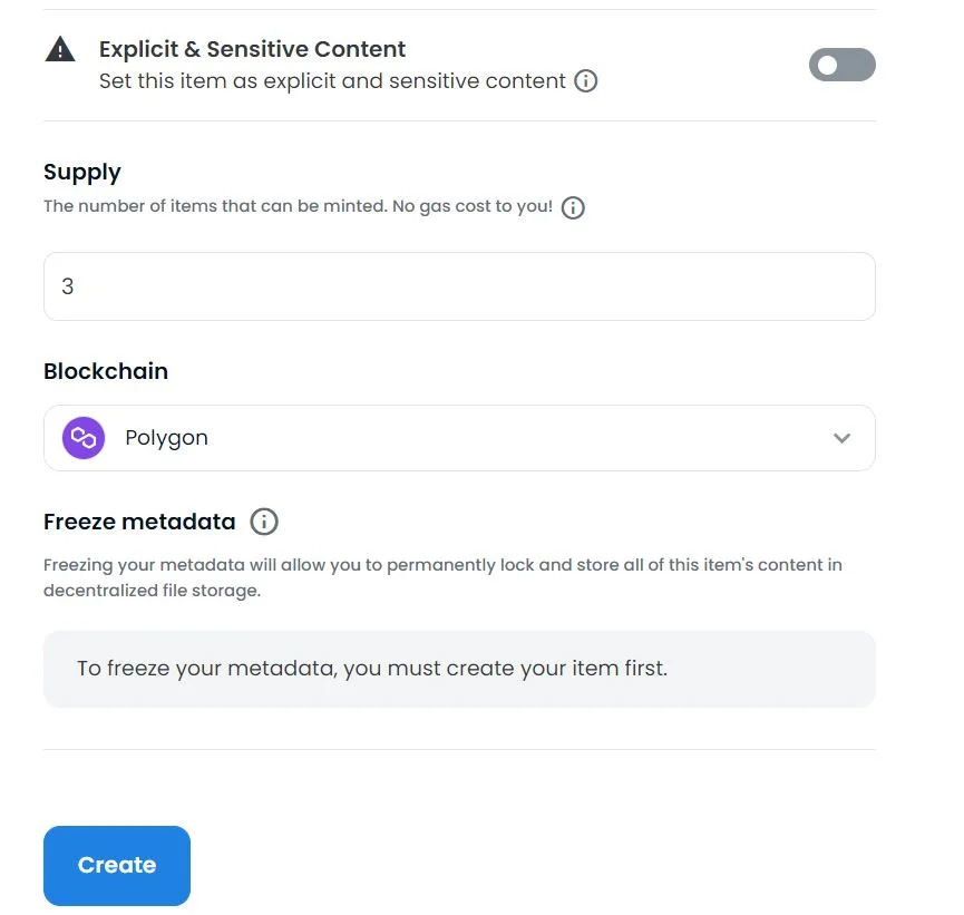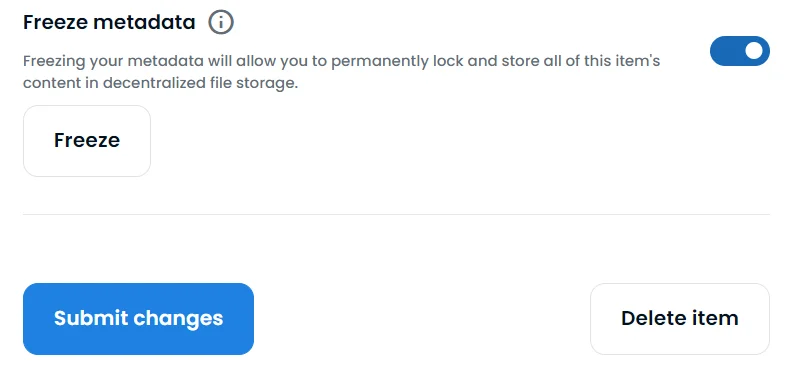 Genom att välja ”Freeze Metadata” kommer din NFT att sparas i en decentraliserad tjänst, vilket innebär att förändringar på filen inte kan ske. Detta sker däremot efter att NFT:en är skapad. I detta läge behöver alltså ingen inställning ske vid denna punkt.