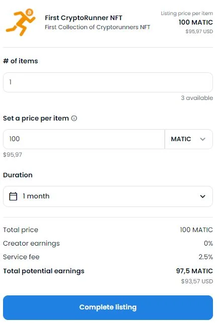 Klicka på ”Complete Listing” för att lägga upp den till försäljning. Din anslutna kryptoplånbok kommer automatiskt att aktiveras varpå en bekräftelse krävs för att din NFT ska kunna läggas ut till försäljning. Med “bekräftelse” menas att godkännande för transaktionen måste ske i den plånbok du kopplat till OpenSea. Det kan alltså även uppstå en transaktionsavgift vid detta tillfälle.