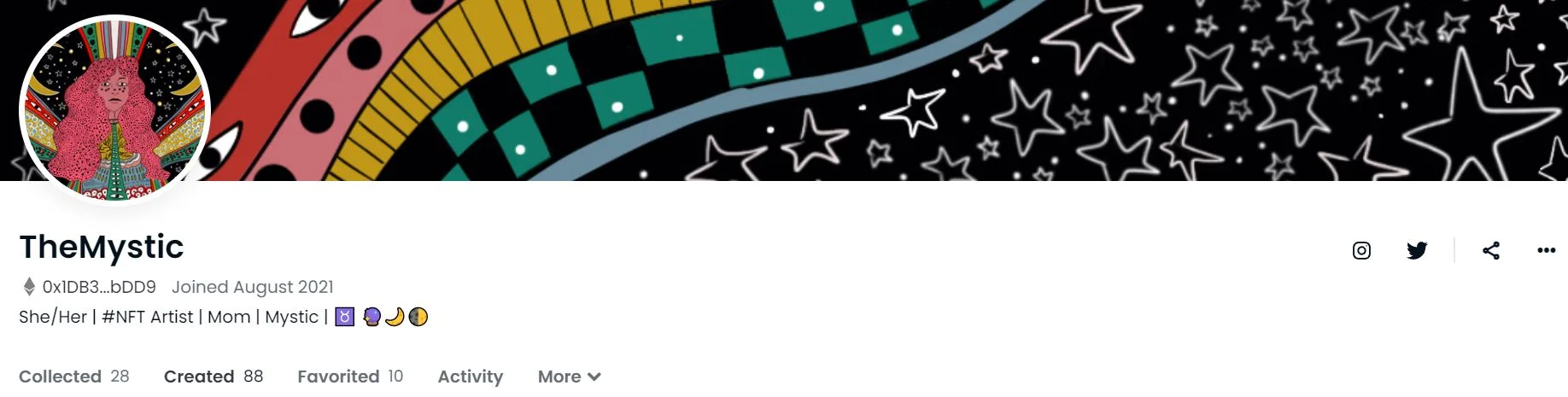 På de allra flesta NFT-plattformar går det att skapa en användarprofil. På bilden nedan visas en presentation av profilen TheMystic.