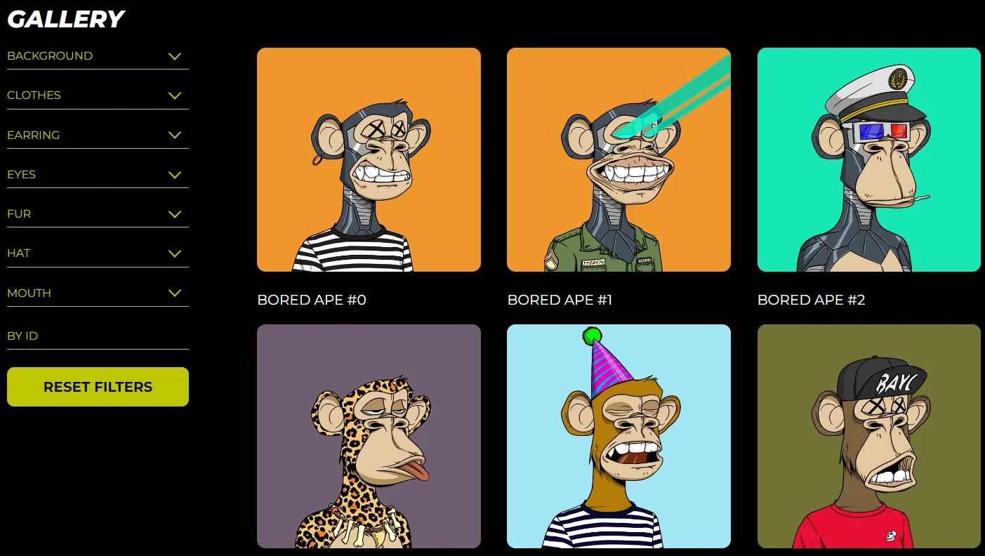 Exempel: Ett exempel visas nedan från projektet Boredapeyachtclub där de digitala aporna presenteras på hemsidan. Bilderna länkar till NFT-plattformen OpenSea och den unika NFT som bilden visar.