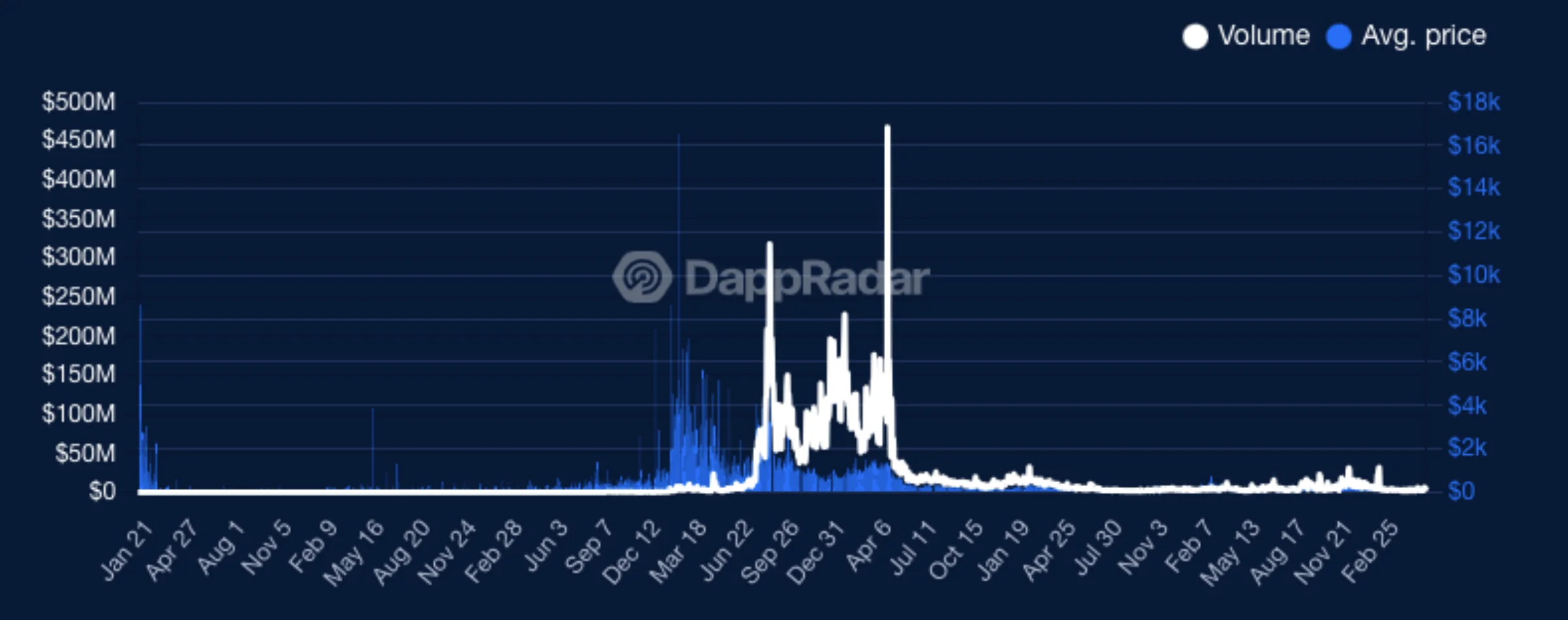 Detta visas tydligt i grafiken nedan som visar statistik från världens största handelsplats för NFT:er, OpenSea. Den ljusblå linjen visar antal transaktioner medan de blåa staplarna visar total omsättning. Grafen sträcker sig från 2018 till 2025.