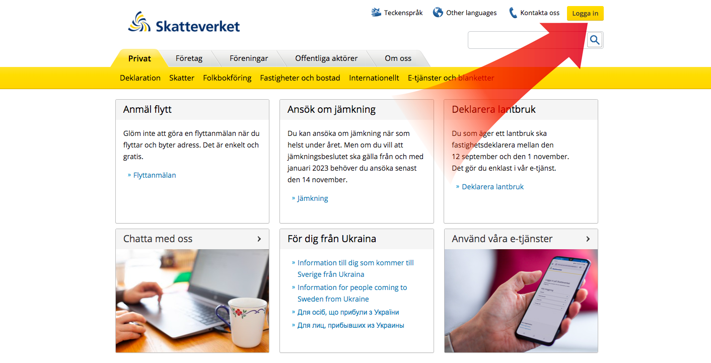 Först och främst behöver du logga in på Skatteverkets hemsida. Det kan du gör direkt med mobilt BankID →