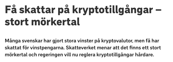 SvT har kommenterat om att mörkertalet på hur många som skattar på kryptotillgångar är stort. Skatteverket rapporterade att omkring 8 000 personer deklarerat för kryptoaffärer år 2024. Det motsvarar endast 5 % av alla de svenskar som sålt kryptovalutor.