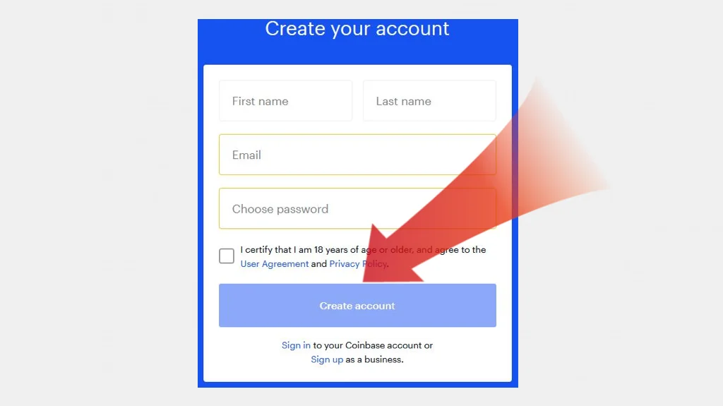 Nästa steg är att fylla i din e-postadress för att kunna logga in på Coinbase. Fyll i ditt namn, efternamn, e-postadress och välj ett lösenord →