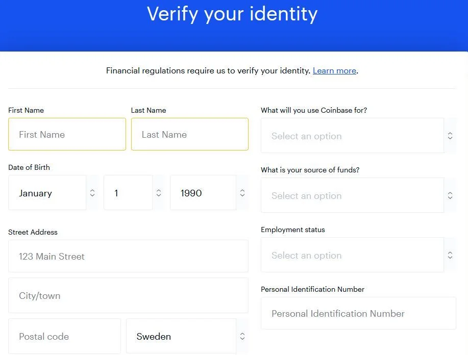 Coinbase kräver en verifikation av personuppgifter och dokument för alla kunder. Det görs direkt i registreringsprocessen för alla kunder som måste fylla i personuppgifter och ladda upp en kopia på sitt ID-kort. Vanligtvis godkänns verifieringen på ett dygn varpå handel kan ske →