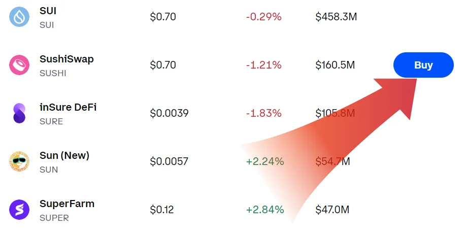 För att köpa SUSHI trycker du på “Trade” i navigeringsmenyn. Därefter kommer en detaljerad lista på tillgängliga kryptovalutor att visas med deras aktuella pris och kursförändring. Välj SUSHI genom att klicka på “Buy”. Välj hur stor summa du vill köpa för och sedan är det bara att genomföra köpet →