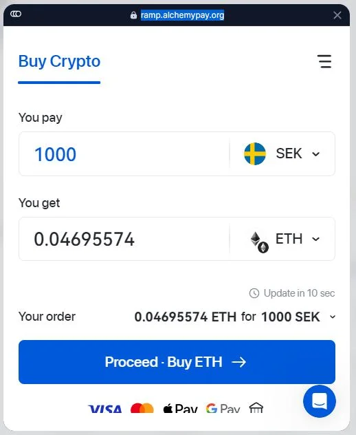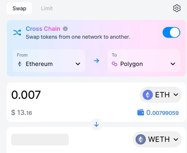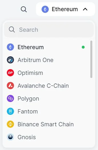 Vänster om ”Connect Wallet” väljs vilken blockkedja som önskas användas. I detta fall väljs Ethereum vilket innebär att kryptovaluta på Ethereum kommer att användas vid växlingen. Därmed kommer Ether att betalas i transaktionsavgift (gasfee).