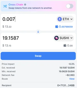 Välj vilken valuta du vill växla samt vilken valuta du vill växla till. På bilden nedan önskas 0,007 ETH växlas till SUSHI. När antalet ETH anges kommer en uträkning automatiskt att ske som visar hur många SUSHI som du kommer att få.