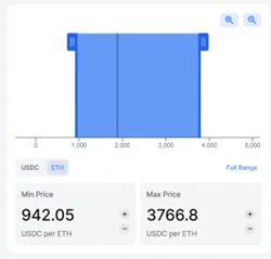 Nästa steg är att välja inom vilket prisintervall som likviditeten ska tillföras. Det innebär i korthet att transaktionsavgifter tjänas så länge som kursen är inom det intervallet. På bilden väljs ett brett intervall som täcker en nedgång på Ether, i förhållande till USDC, på 50% och uppgång på 100 %.