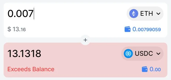 På bilden nedan saknas det USDC i MetaMask vilket innebär att likviditeten inte kan tillföras. En lösning blir därmed att först föra över minst 13,1318 USDC till plånboken innan tillförsel av likviditet kan slutföras.
