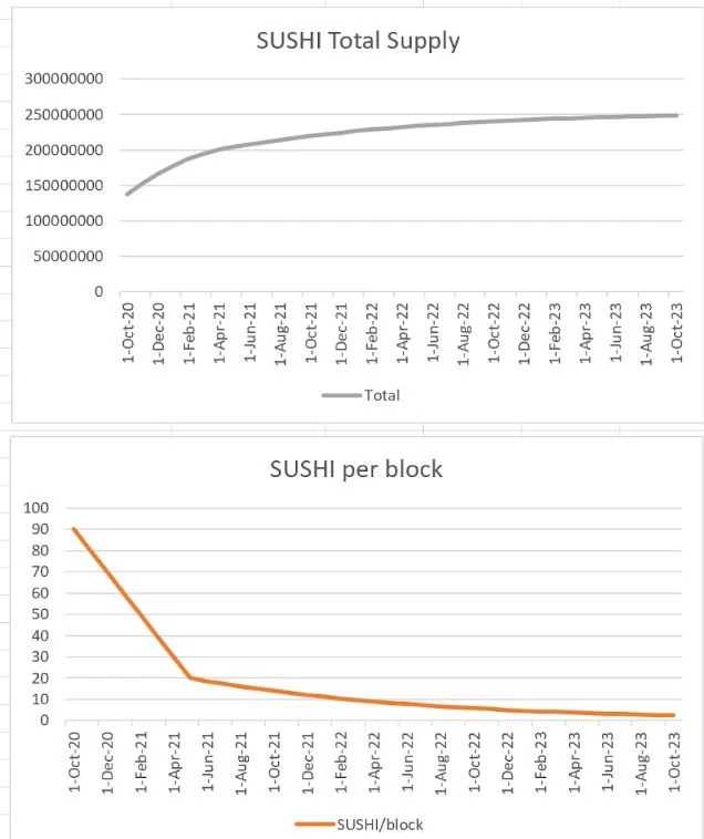 I början av 2024 fanns det ungefär 192 miljoner SUSHI i omlopp. Det totala utbudet kommer att uppgå till max 250 miljoner. SUSHI har primärt en governancefunktion. Det innebär att de som har valutan kan rösta på förslag gällande förändringar inom SushiSwaps ekosystem.