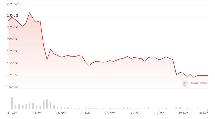 Det stora raset, i början av november, kan troligtvis tillskrivas kraschen i FTX och den oro som detta skapade på hela kryptomarknaden. Under samma period föll även bitcoin med cirka 25 %.