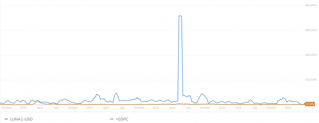 I grafen ovan visas historisk volatilitet för både LUNA (blå färg) och S&P 500 (orange färg), vilket är ett index som representerar de 500 största amerikanska bolagen. Historiskt har LUNA uppvisat en klart högre volatilitet. Men på senare år har kryptovalutans volatilitet kommit att sjunka till att bli lika med 0 %, vilket den fortsätter att vara år 2025.
