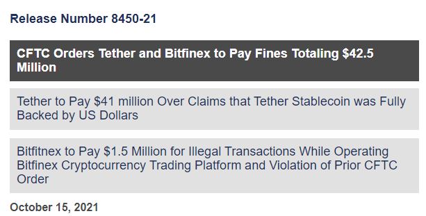 Ett tecken på att Tether inte har tillräckligt med tillgångar är att de, år 2021, blev fällda i en juridisk tvist med amerikanska CFTC (Commodity Futures Trading Commision). Stämningen resulterade i att Tether, och Bitfinex, fick betala 42,5 miljoner USD i böter för ”untrue or misleading information”. Detta bland annat kring uppbackningen av deras stablecoins.