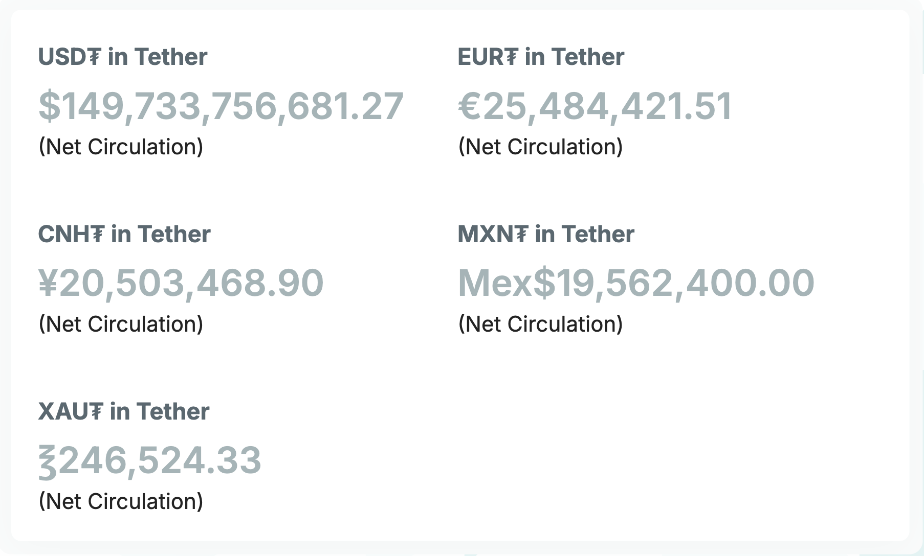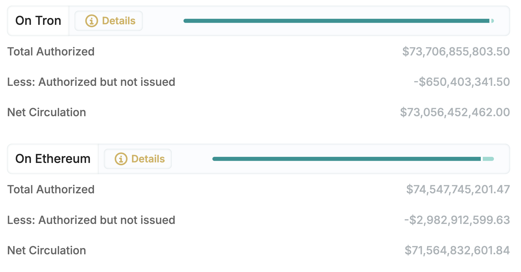 I början av 2025 fanns det på dessa kedjor 74,54 miljarder respektive 73,70 miljarder USDT. Totala utbudet går alltid se på Tethers hemsida, vilket visas nedan.