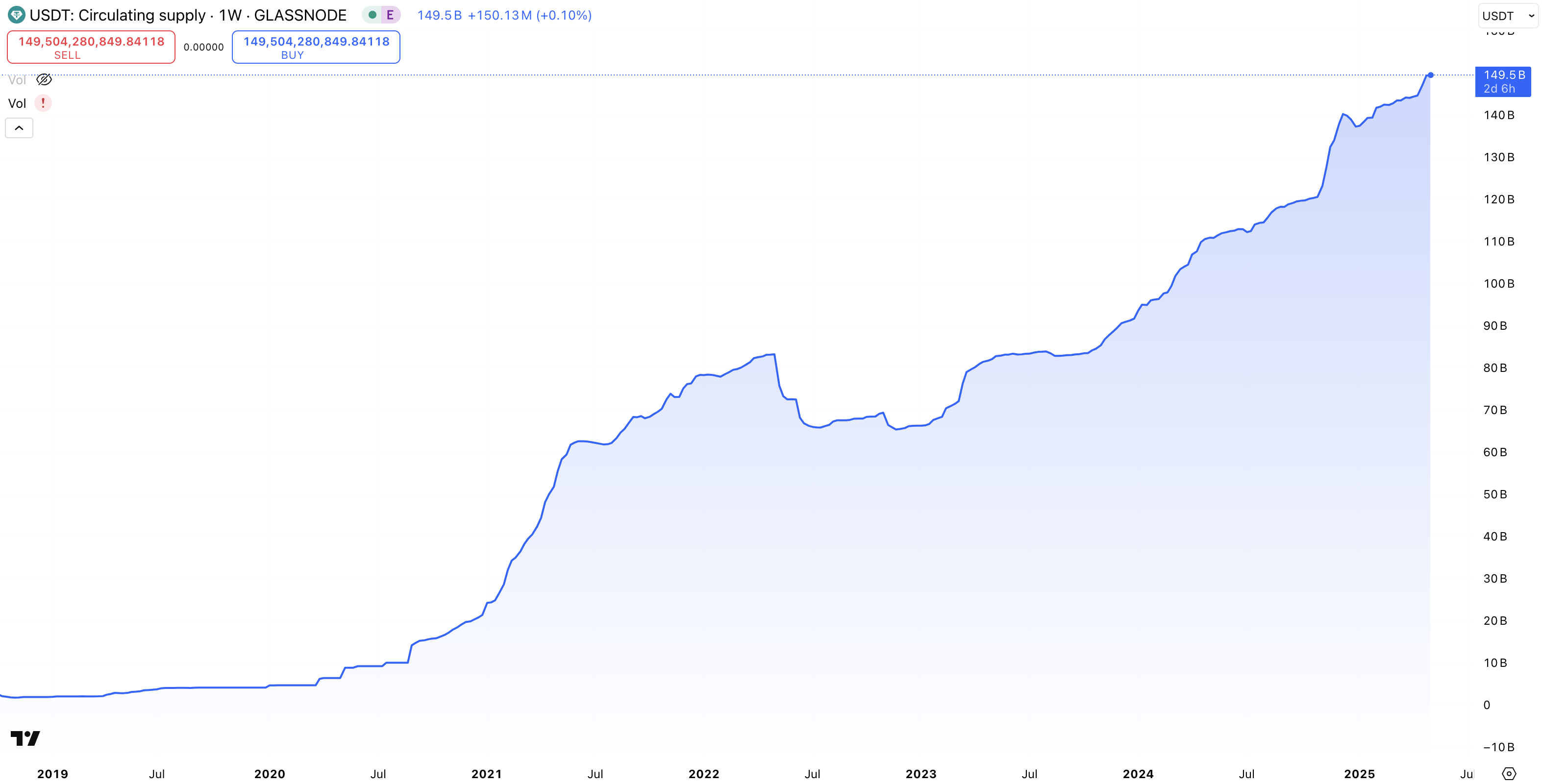 Som bilden nedan visar, ökade antalet USDT i omlopp drastiskt under 2020 och 2021. Den 1:a januari 2020 var market cap på 46 miljarder USD. Två år senare, i januari 2022, var market cap uppe på 78 miljarder USD. I början av 2025 hade USDT ett market cap på nästan 150 miljarder USD.