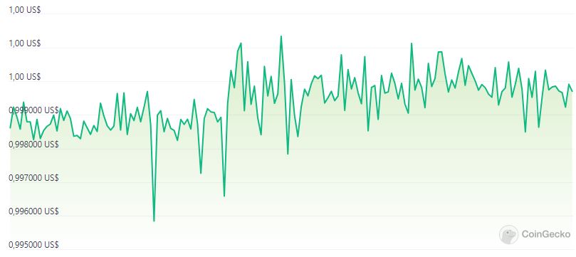 Priset rör sig snarare med 0.10 % – 0.20 % på daglig basis. Det har även förekommit att USDT ”tappat sin peg” vilket innebär att värdet gått upp, eller ner, med mer än 1 %. Bilden nedan visar priset på USDT över en vecka i början av 2025.