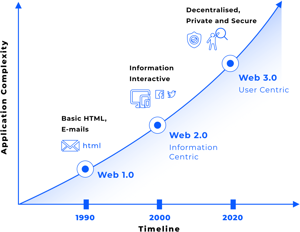 Web3 brukar förklaras med “nästa generations internet”. Detta utifrån de extremt stora förändringar som tekniken innebär. Enklast förklaras detta genom att utgå från hur internet har utvecklats genom åren via web1 och web2 till web3.