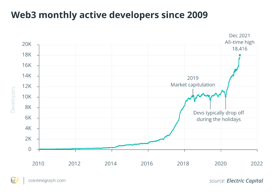 Nedan ser du statistik över antalet aktiva utvecklare för web3 per månad sedan år 2009.